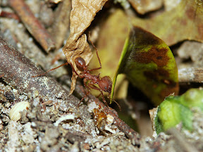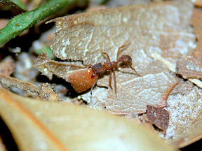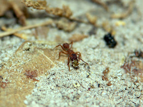 Eine weitere Art die ich noch nicht genauer bestimmen konnte, fand sich ebenfalls sehr häufig, obwohl sie 2008 gänzlich abwesend war. Es handelt sich dabei um eine kleine Pilzzüchterin, welche sich allerdings auf herumliegendes Pflanzenmaterial spezialisiert hat. Die Arbeiterinnen schneiden daher kein lebendes Material, sondern widmen sich dem Sammeln von Samenkapseln, Schalen von Nüssen, Teilen von Blüten und dergleichen. Es dürfte sich dabei um eine Art der Gattung Trachymyrmex handeln.