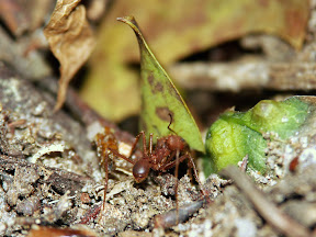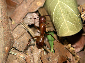 Folgende Art lebt nicht direkt im Baum, aber ihre Kolonien finden sich doch meistens in direkter Nähe zu solchen. Ihre Arbeiterinnen furagieren auf der Suche nach Nahrung ebenfalls an den Bäumen auf und ab. Überaus interessant ist das Fluchtverhalten dieser Art. Kommt man ihnen zu schnell näher, springen sie "vor Schreck" vom Baumstamm ab und lassen sich auf den Waldboden fallen. Dort angekommen, suchen sie sich nicht direkt ein Versteck, sondern verharren dort einfach völlig regungslos. Ihre braun-rote Färbung scheint ihnen als Tarnung völlig auszureichen. Erst bei erneuter Störung verstecken sie sich rasch unter Blättern oder Ästen.