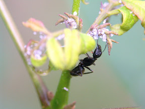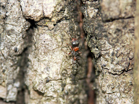 Zu meinem Bedauern war eine Gattung in diesem Jahr nur noch schwach vertreten. Arten der Gattung Pseudomyrmex leben in holen Ästen und Zweigen der Bäume und werden daher umgangssprachlich gerne "Twig Ants" genannt. Sie sind bei den Einheimischen wohl bekannt, was auf ihren schmerzhaften Stich zurück zu führen ist. Man sieht ihnen die nahe Verwandtschaft mit Wespen deutlich an und auch ihre Bewegungen sind alles andere als typisch für Ameisen. Sie bewegen sich in schnellen, Schub-artigen Bewegung über die Äste und weichen Hindernissen dabei geschickt aus. Sie können ausgezeichnet sehen und sind daher auch schwer zu fotografieren. Sie besitzen das Talent kurzerhand auf die Rückseite des Astes zu huschen, weshalb ich sie gerne mit kleineren Insekten füttere, um sie zumindest kurzzeitig ruhig zu stellen
