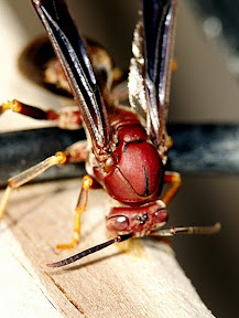Polistes metricus ist eine der schönsten Vertreterinnen dieser Gattung, die mir in Texas begegnet sind. Man trifft diese großen und durchaus Respekt-einflößenden Wespen wirklich häufig an. Ihre Nester bleiben eher klein und wer sich die Zeit nimmt sie zu beobachten, wird feststellen, dass sie sehr friedliche und eher scheue Zeitgenossen sind. Hier einige Bilder eines Exemplars das im Jesse H. Jones Park auf der Suche nach Holz war. Die Männchen zeigen in ihrer Färbung einen deutlich höherem Gelbanteil und das Gesicht zeichnet eine gelb-orange, Masken-ähnliche Zeichnung.